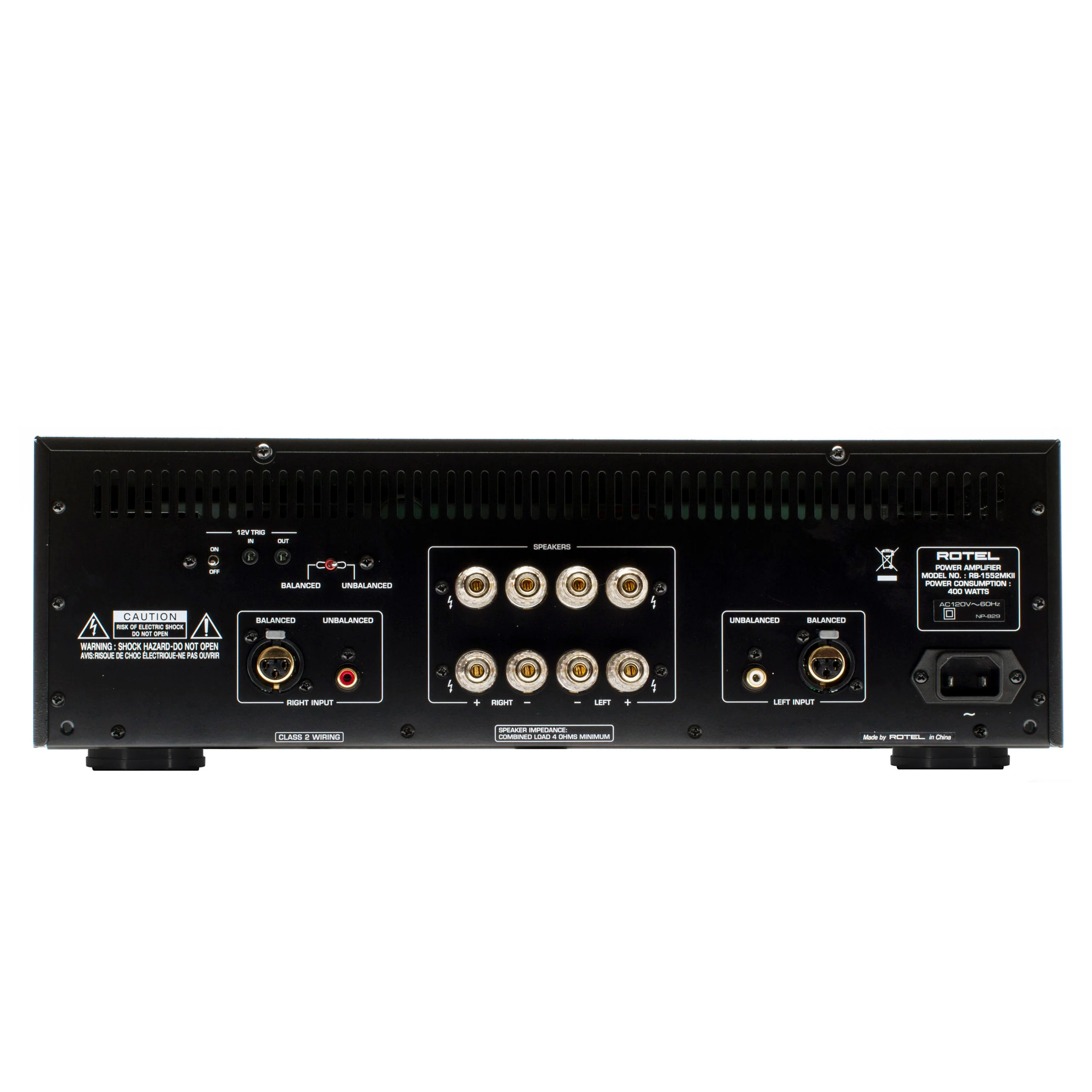 Rotel engineering’s fanatical attention to detail means the sum is greater than the parts, what we call our Balanced Design Concept*. Each aspect of design is carefully considered holistically to result in maximum audio performance; from the selection of an over-sized power supply featuring a highly efficient, low magnetic field toroidal transformer to multiple, high-current bipolar output transistors. Circuit topology is planned, implemented, evaluated, and adjusted to achieve optimum results. The RB-1552MKII features independent left and right power rectification stages and decoupling, and is essentially a mono block design. Further evidence of design over-spec is in the selection of premium “slit-foil” capacitors, which provide plenty of reserve energy for extremely dynamic audio passages and are able to quickly replenish themselves due to the nature of their unique design. Input options are balanced XLR or unbalanced RCA connectors.